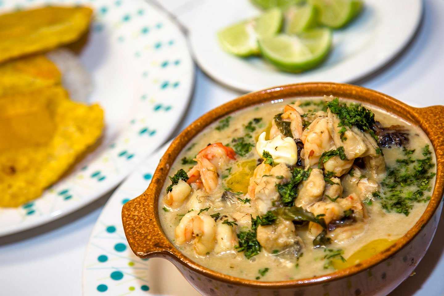 Crema de cabeza de langostinos: cabeza de langostino molida en leche de coco y aliños de la región. Cuy asado en brasas: cuy (roedor) con aceite achotado, pimienta negra, ajo molido, comino, pimienta chapa, orégano, papa, sal y pimienta.